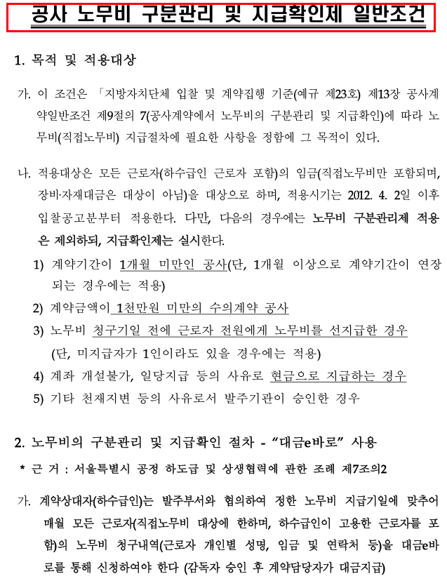 - 노무비 지급확인제: 발주기관이 매월 근로자 개인별 계좌로 임금이 실제 입금되었는지 내역을 확인하는 제도입니다.